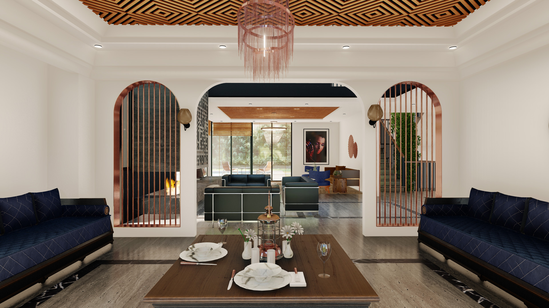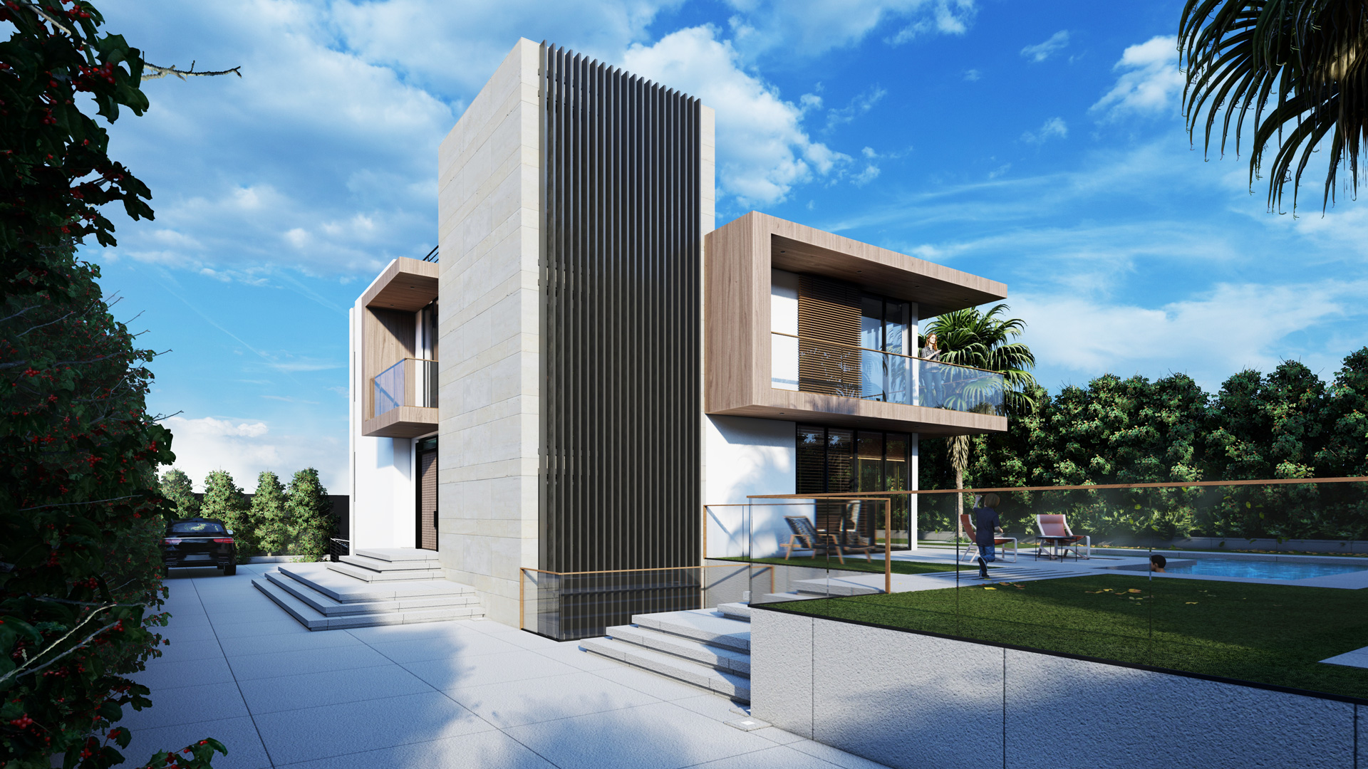 This house embodies a modern and sustainable approach with an emphasis on clean lines and geometric volumes that combine form and function, minimizing the home's cooling load and enhancing its overall energy performance. The building’s layout is thoughtfully designed, featuring large glass windows that facilitate natural light penetration, reducing the need for artificial lighting and contributing to energy efficiency. The cantilevers and the vertical louvered elements serve as a smart bio-climatic feature, offering sun shading to control solar heat gain while also allowing for passive cooling through natural ventilation The open outdoor spaces and terraces encourage social interaction and a connection with nature, promoting a holistic living experience that's in harmony with sustainable principles. The landscaping design presents a sophisticated blend of formality and naturalism, The choice of native plant species that require less water and maintenance.